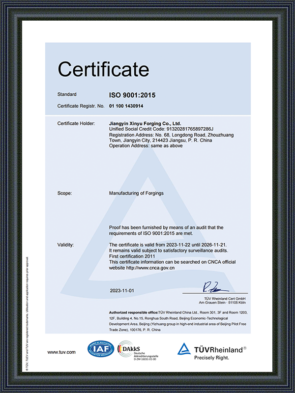 Xinyu Forging Co., Ltd. grundades 2004 och ligger i Zhouzhuang Town, Jiangyin City, Jiangsu -provinsen. Vår fabrik ligger längs Shanghai-Nanjing Expressway, cirka 110 kilometer väster om Shanghai, 120 kilometer öster om Nanjing och cirka 8 kilometer söder om floden Yangtze. Detta strategiska läge gör det möjligt för oss att dra nytta av bekväm mark och havstransporter.