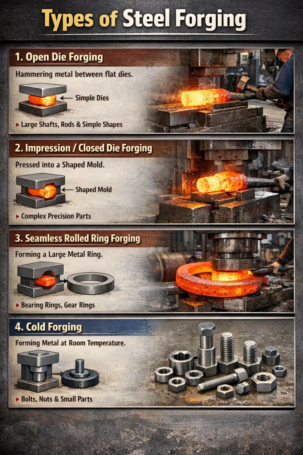 Inom metallbearbetningsområdet finns det många olika smidesprocesser. Enligt den vanligaste klassificeringsmetoden, stålsmide kan vanligtvis delas in i följande fyra kategorier: