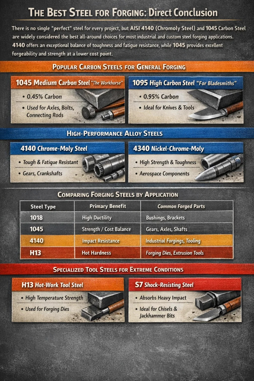 Det finns inget "perfekt" stål för varje projekt, men AISI 4140 (Chromoly Steel) och 1045 Carbon Steel anses allmänt vara de bästa allround-valen för de flesta industriella och anpassade stålsmide applikationer. 4140 erbjuder en exceptionell balans mellan seghet och utmattningsbeständighet, medan 1045 ger utmärkt smidbarhet och styrka till en lägre kostnad.